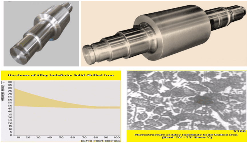 Chilled Cast Iron Rolls have a structure consisting of more flake graphite with few uniform carbides in a Pearlitic matrix. Harder grades have a Bainitic-Martensitic matrix with an increased amount of carbides. The presence of flake graphite improves spilling resistance and also enhances resistance to fire cracking. All of these properties combined with the excellent surface finish make AIC Alloy Indefinite Chill very suitable for rolling flats sections and similar products where surface finish is critical. Due to alloy additions, hardness penetration is better than that of a clear chill roll and this material may be used in applications with deeper groves such as small and medium section rolling and also for finishing billets. Generally there are three types; (I) Definite Chilled Cast Iron, (II) Indefinite Chilled Cast Iron & (III) Bainitic Chilled Cast Iron.